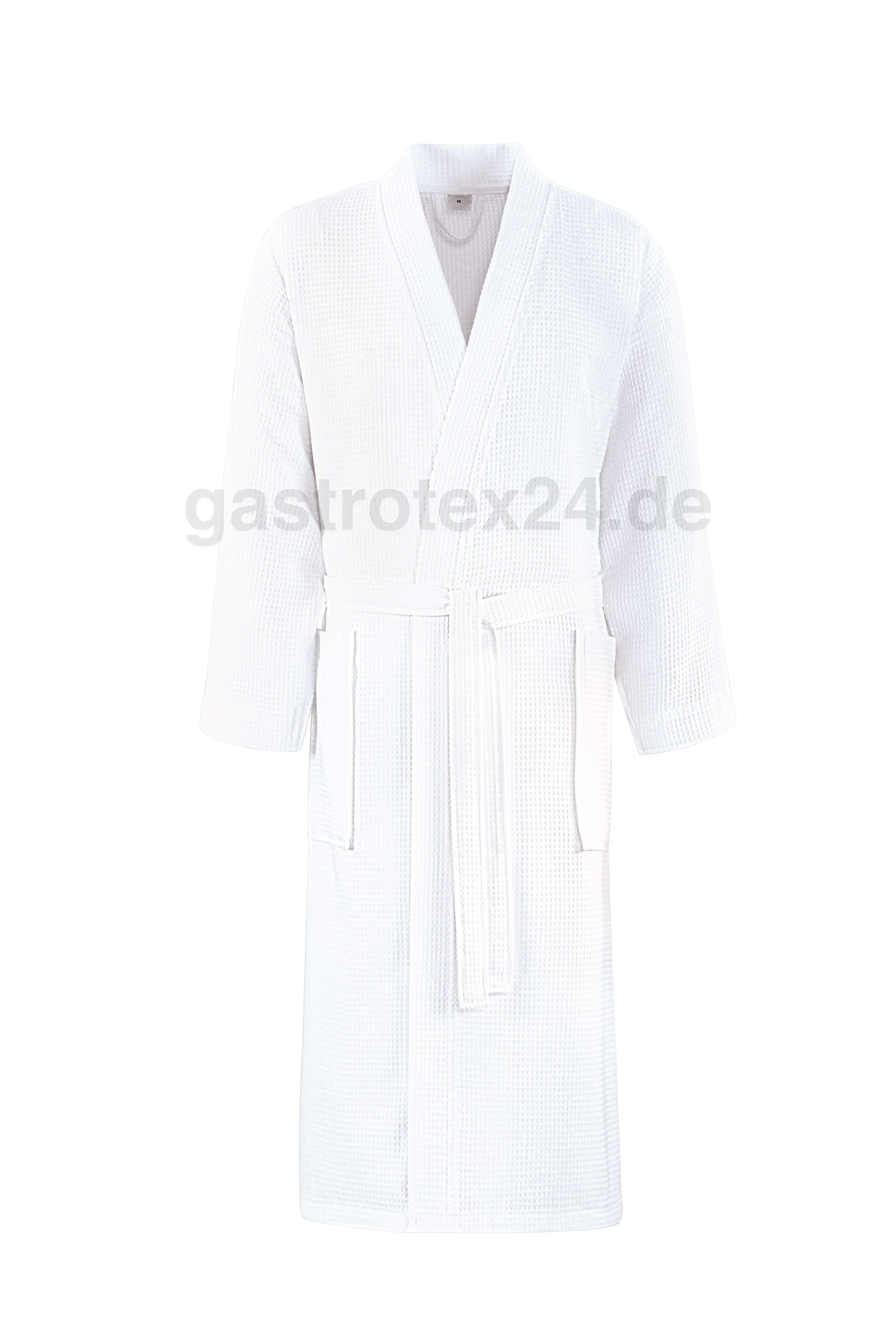 Waffelpiquet-Bademantel weiß "Amrum" mit Kimonon-Schnitt aus 100% Baumwolle in Größe XL. Leichter Waffelpique-Bademantel mit 220 gr/qm gewebt as vorgewaschenem Zwirnfäden. Der leichte und strapzierfähige Bademantel für Selbstwäscher oder Großverbraucher. Lieferbar sofort ab Lager. Verkaufseinheit: stückweise.