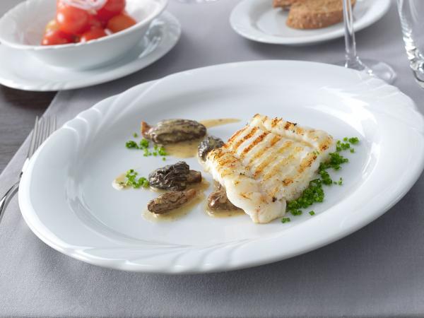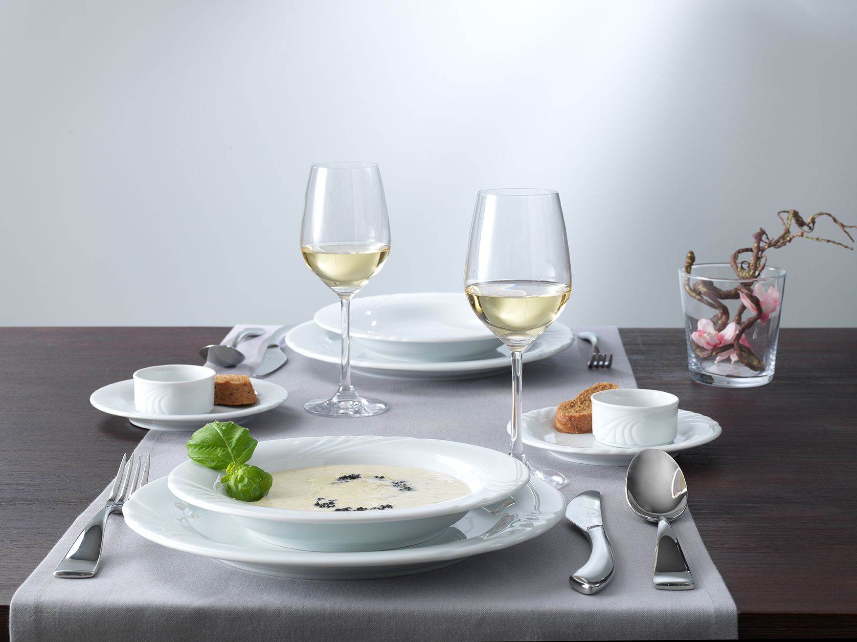 Teller flach 31 cm aus der Serie "Ambiente" in Farbe weiß vom großen Hotelporzellan-Hersteller Eschenbach. Die Serie "Ambiente" besticht durch das schöne 3-Wellen-Dekor auf der Fahne. Der Teller flach wird in Mehrfachfunktion als großer Eßteller und Grillteller im Hotel, Restaurant und beim Catering eingesetzt. Der Teller ist spülmaschinenfest, bruchkantenverstärkt und stapelbar. Die Verkaufseinheit ist 6 Stück pro Karton.