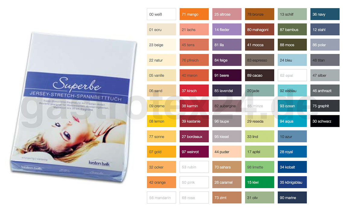 Farben: altrosa, anthrazit, apfel, aqua, aubergine, azur, bambus, beere, beige, bleu bordeaux, bronze, cacao, caramel, creme, ecru, eisblau, espresso, feige, flieder, gold, graphit, jade, karmin, kastanie, kiesel, kirsch, kiwi, kobalt, königsblau, lachs, lavendel, lemon, lila, limette, lind, mahagoni, mango, marine, maron, mocca, moos, natur, navy, ocker, oliv, orange, ozean, pfirsisch, polar, puder, reseda royal, sahara, sand, schilf, schwarz, silber, sonne, stahl, taupe, terra, titan, vanille, weinrot, weiss, zimt