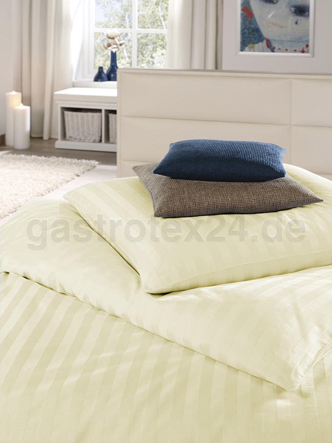 Hotel-Betwäsche-Set "Linda", Garnitur 2-teilig: Bettbezug 135/200 cm + Kopfkissenbezug 80/60 cm mit Hotelstreifen 25 mm. Farben: weiß, gelb, hellblau. Exrtrakräftige, strapazierfähige Objekt-Bettwäsche aus 100% Baumwollle mit 175 gr/qm für Hotel, Ferienwohnungen und Klinik. Koch- und chlorechtee Bettwäsche-Garnitur. Dauerserie. Lieferbar sofort ab Lager. Sondergrößen sind ebenfalls auf Anfrage möglich.