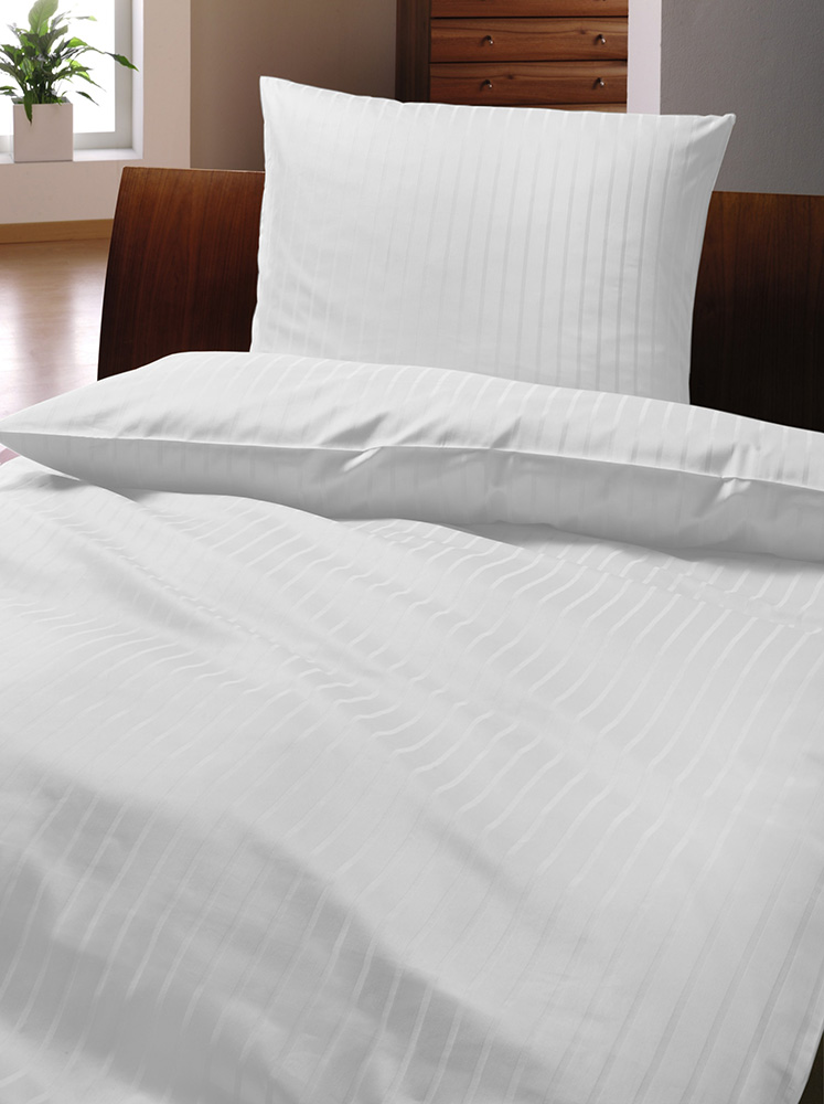 Hotel-Bettwäsche-Garnitur "Luna" weiß 135/200 + 80/80 cm mit unverwechselbarem Wechselstreifen 6/24 mm. Farben: weiß. Hochwertige, leichte und feinfädige Damast-Bettwäsche aus supergekämmter 100% Baumwolle mit 140 gr/qm für 3-4-Sterne-Hotels, Pensionen, Ferienwohnungen und andere anspruchsvolle Gastgeber aus dem B2B-Bereich. Koch- und chlorechte Bettwäsche mit Hotelverschluß. Dauerserie. Lieferbar sofort ab Lager. Sondergrößen sind ebenfalls auf Anfrage möglich.