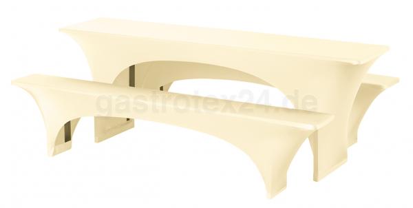 Stretch-Bierbankhussen-Set "Maastricht" 50 cm champagner, Set 3-teilig, Farbe: champagner, 90% Polyester/10% Elasthan, Gewicht: 210 gr/qm, Wäsche: 40°C, nicht chloren, Trocknung: 1 Punkt, pflegeleicht, bügelfrei. Lieferumfang: 1 x Tischhusse 50/220 cm (Höhe 70 cm) plus 2 Sitz-Bankhussen 25/220 cm (50 cm). Für Bierzeltgarnituren mit Standard-Beinabstand 45 cm (auf kurzer Seite).