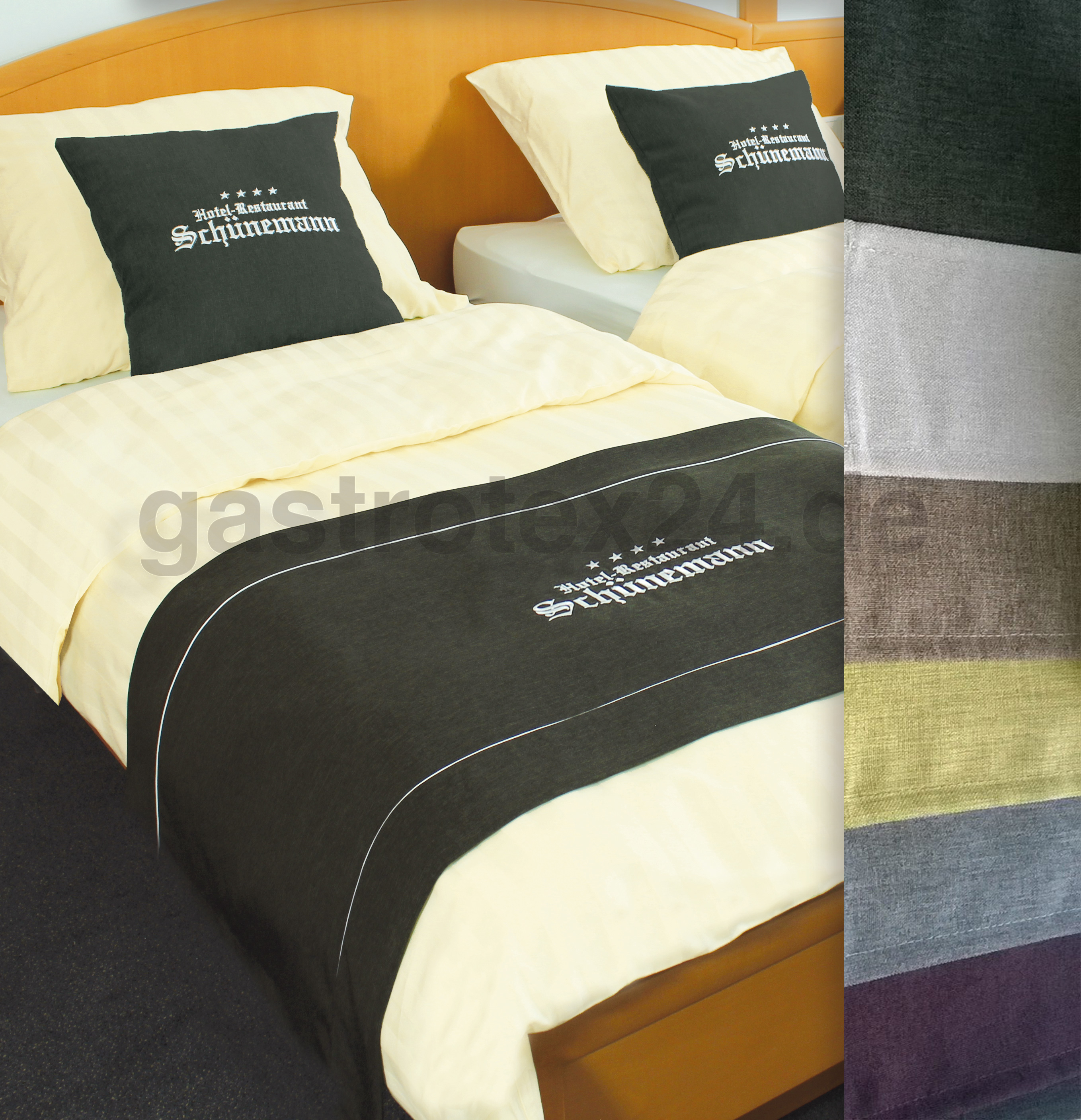 Hotel Bettläufer "Milano" 65/250 cm in feiner Uni-Strukur mit elegant changierender Optik. Doppellagig gelegter Stoff mit Biese. 100% Polyester, Gewicht: 270 gr/qm, 40°C Wäsche. Nicht chloren. Nicht trockergeeignet. Bügeln: 1 Punkt. Farben: beere, taupe, nougat, grün, silber, schwarz