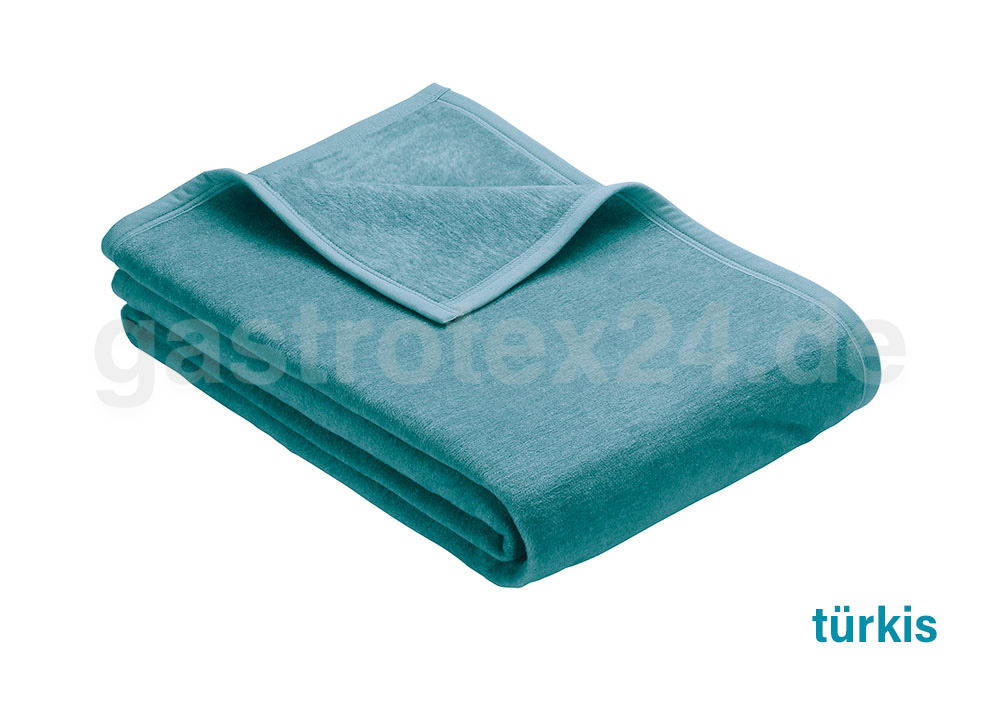 Schlafdecke / Wohndecke "Porto" 150/200 cm, Farbe: türkis, Material: 58% Baumwolle, 35% Polyacryl, 7% Polyester, Gewicht: ca. 430 gr/qm, Wäsche: 30°C (Schonwaschgang), trocknergeeignet (1 Punkt), chemische Reinigung. Pflegeleichte Wohdecke / Kuscheldecke für Hotels mit vierseitigem Veloursbandeinfassung. Warme und weiche Hoteldecke, pflegeleicht.