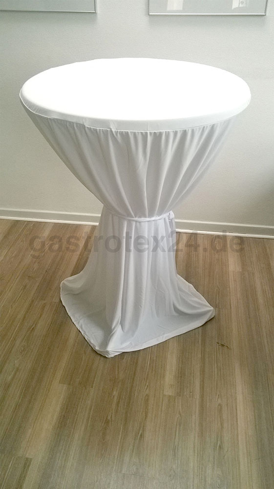 Stehtischhussen "San Remo" 85 cm rund, Farbe: weiß, mit Bindeschal, 100% Polyester, pflegeleicht, bügelleicht / bügelfrei, Gewicht: 130 gr/qm, Wäsche: 40°C, nicht chloren