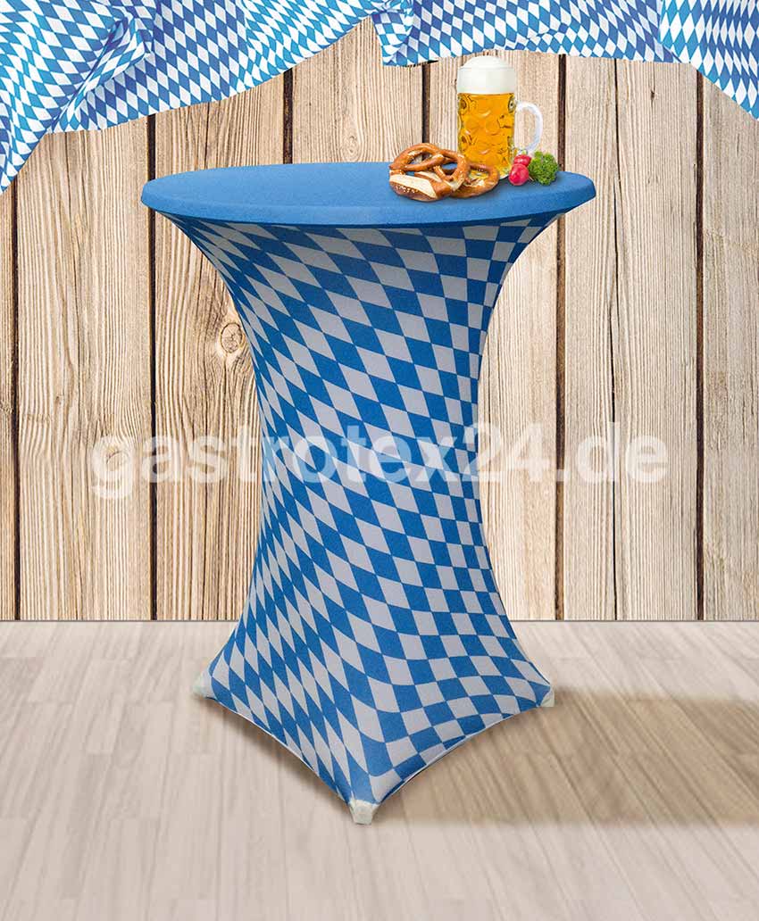 Stretch-Stehtischhusse "Bayern" 80-85 cm rund, mit Bayrischen Rauten-Motiv bedruckt, für Kreuzfuß-Stehtische mit vier Füßen, Lieferumfang: Hauptbezug, Material: 92% Polyester/8% Elasthan, Gewicht: 230 gr/qm, hochflexibler Jersey-Stretch, für Tischhöhen 105 bis 115 cm, Oekotex 100-Standard. Bügelfrei. Pflegeleicht. Lieferung sofort ab Lager. Bestellen Sie den Markenartikel in Gastro-Qualität direkt hier.